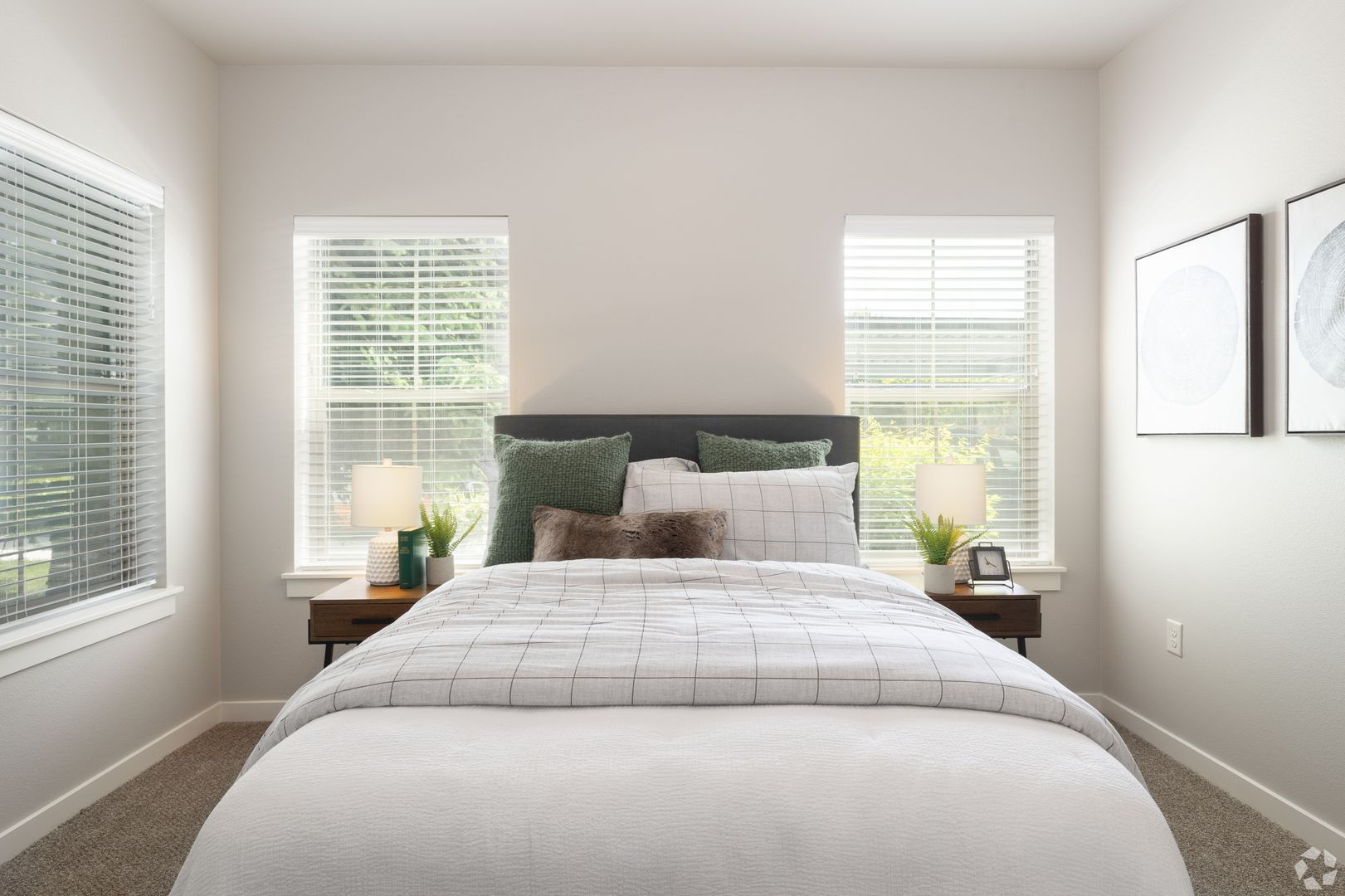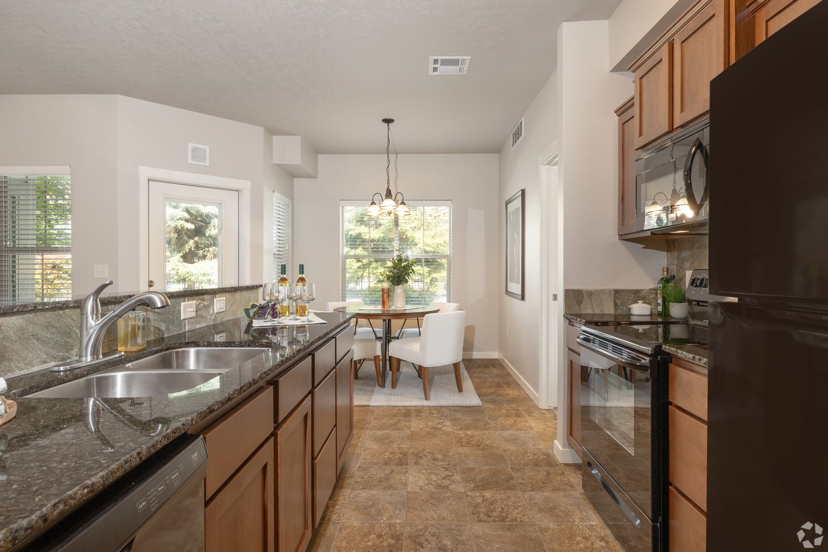 You will find that all our apartment homes include one of our 3 custom interior packages. Our custom interiors include upgraded GRANITE rough edge countertops, stainless steel in-set sink, retractable kitchen faucet, custom cabinetry, carpet with 8lb pad, warm interior paint, large windows with natural light, black on black appliances with flattop cook range, icemaker, front Loading washer and dryer, private patio or balcony with storage, and an abundance of closet space.